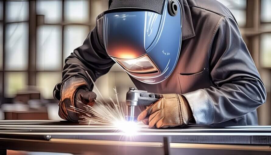 A close up of a welder making a weld on two pieces of sheetmetal