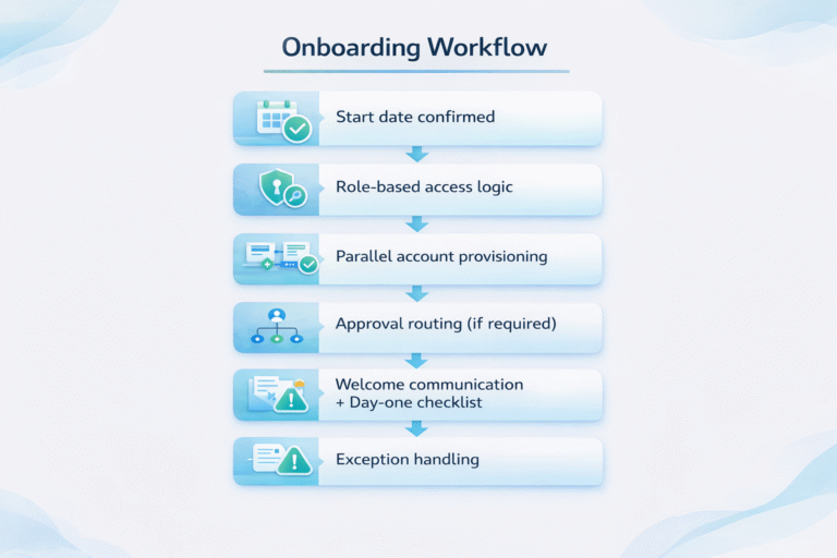 Account creation becomes standardized. Approvals follow defined rules. Notifications happen automatically. HR and IT spend less time chasing tasks and more time improving the employee experience itself.
